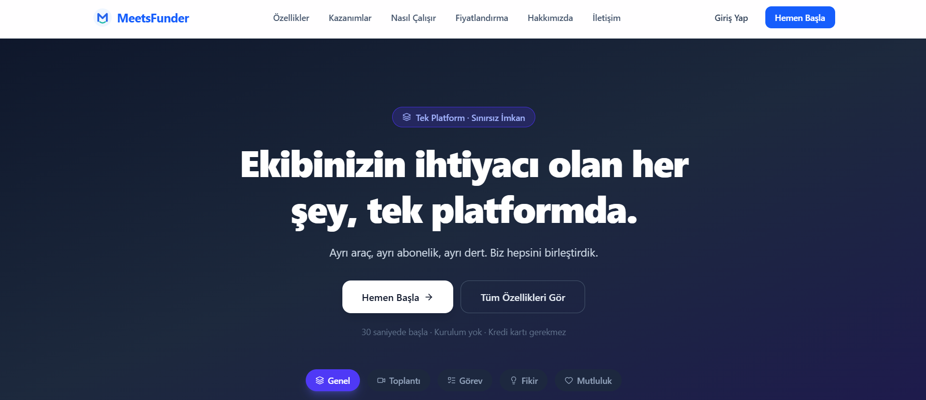 MeetsFunder, video toplantı, görev yönetimi, fikir panosu ve AI asistanı tek platformda birleştiren bir iş birliği aracıdır. Yapay zeka destekli chat ile ekipler fikir üretebilir, görev planlayabilir ve anlık destek alabilir — ayrı araçlar arasında geçiş yapmadan. Startup'lar, üniversite toplulukları ve küçük ekipler için tasarlandı.