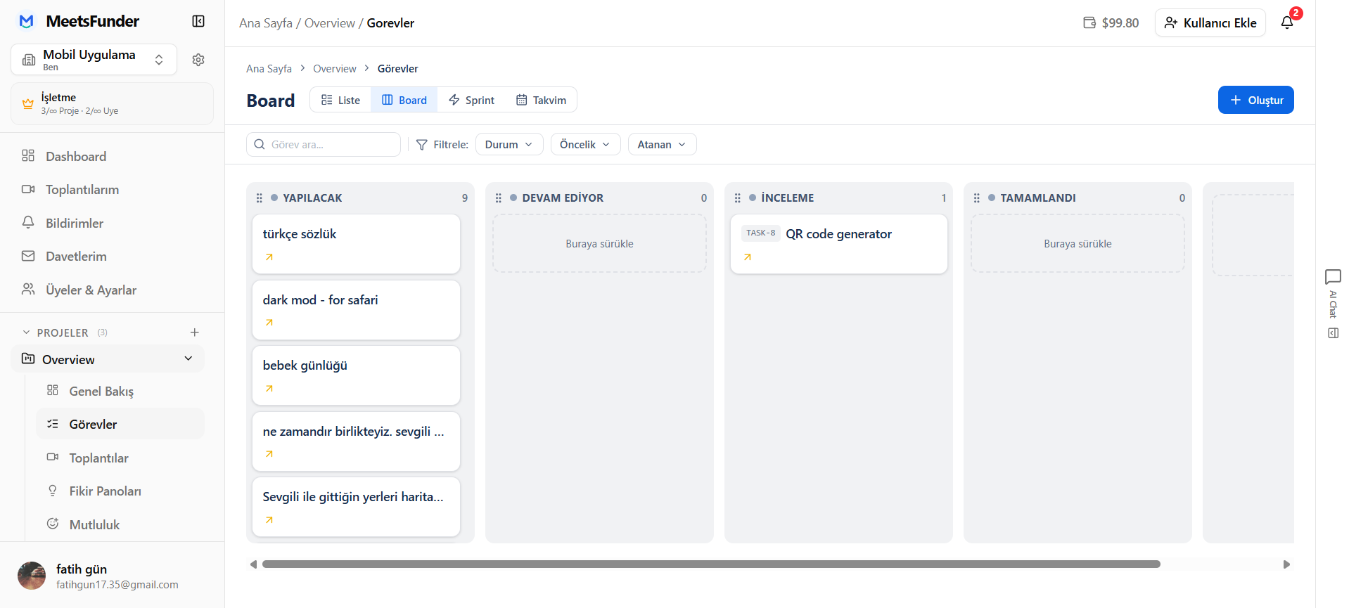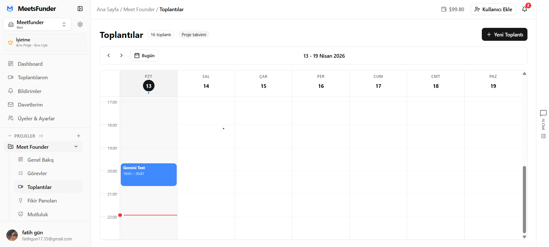 Neden MeetsFunder? Ekipler genellikle toplantı için bir araç, görev takibi için başka bir araç, beyin fırtınası için bir diğerini kullanır — üstüne bir de AI aracı ekler. MeetsFunder bu parçalanmayı ortadan kaldırır. Tek platform, tek akış. Özellikle sınırlı bütçe ve kaynaklarla çalışan ekipler için tasarlandı: startup kurucuları, üniversite kulüpleri, freelance takımlar.